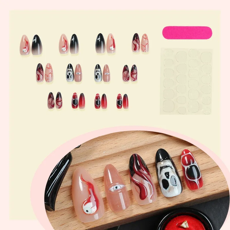 24PCS Halloween False Nails Red Gradient Skull Blood Horror Eye Pattern French Press on Nails Full Cover Wearable Fake Nails Art